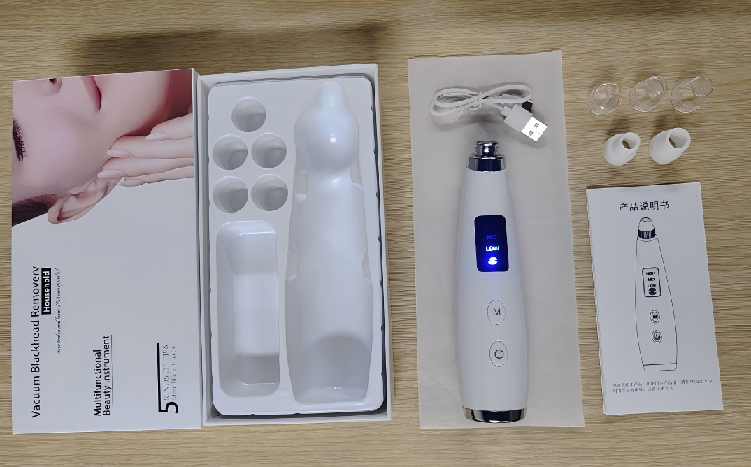 Package Contents: Main unit, User manual, Charging cable, 5 suction tips, 5 silicone rings, 5 filter sponges